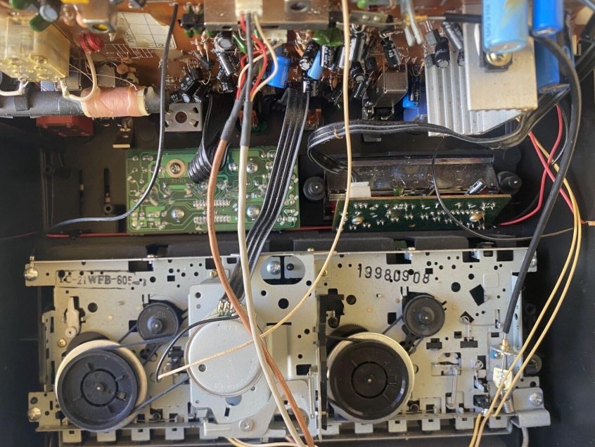 Two woofers and possibly two tweeters, dual cassette decks, two telescoping antennas, ALC search, auto stop and auto reverse, a beat switch, built-in condenser mic and mic input, tape counter, RCA connections, loudness button, phono input, mix volume control, headphone jack, LED VU and output power indicators, balance control, tape selector, and a 5-band equalizer. Some CDX-931’s that have been opened up have no tweeters under the silver caps. It’s possible the tweeter grills and caps are just for looks and there aren’t actually any tweeters in the CDX-931.
